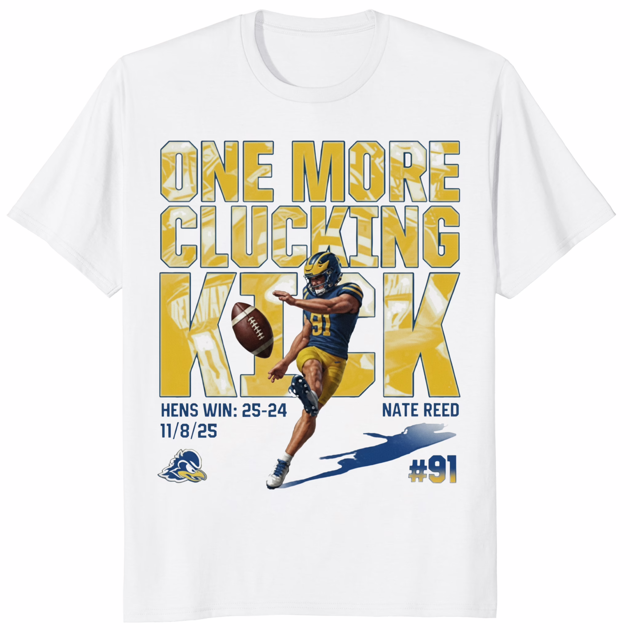 The design of the One More Clucking Kick Nate Reed Shirt was born from that unforgettable clutch moment when Nate Reed made history. The bold text, playful pun, and vintage sports aesthetic combine to create a tee that celebrates determination, spirit, and humor.