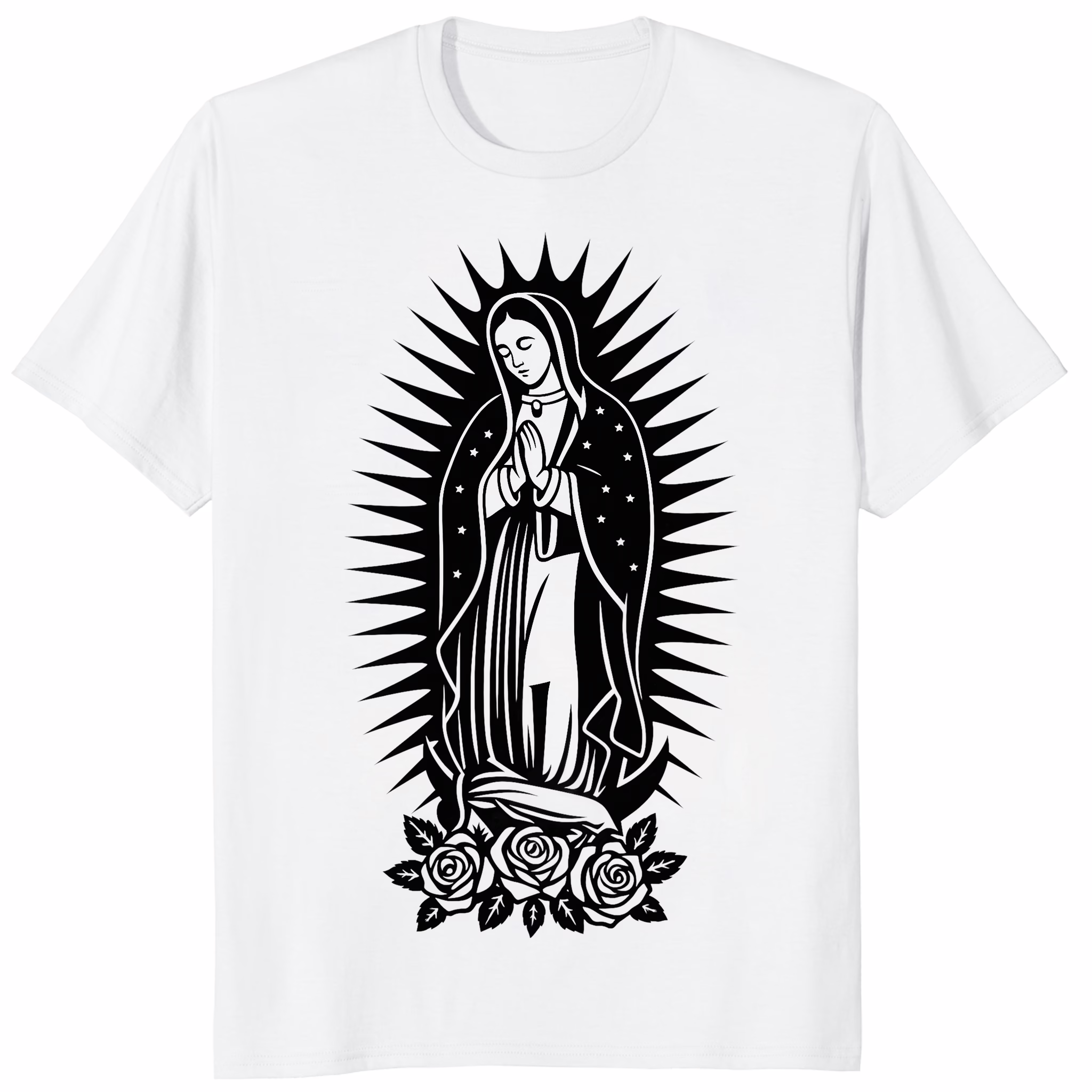 The design of the Our Lady of Guadalupe Virgin Mary with Roses Shirt draws from one of the most beloved and widely recognized images in the world: the apparition of the Virgin Mary to Juan Diego in 1531. The composition includes the Virgin surrounded by radiant light and framed by roses, recalling the miraculous moment when roses bloomed out of season as a sign of divine presence.