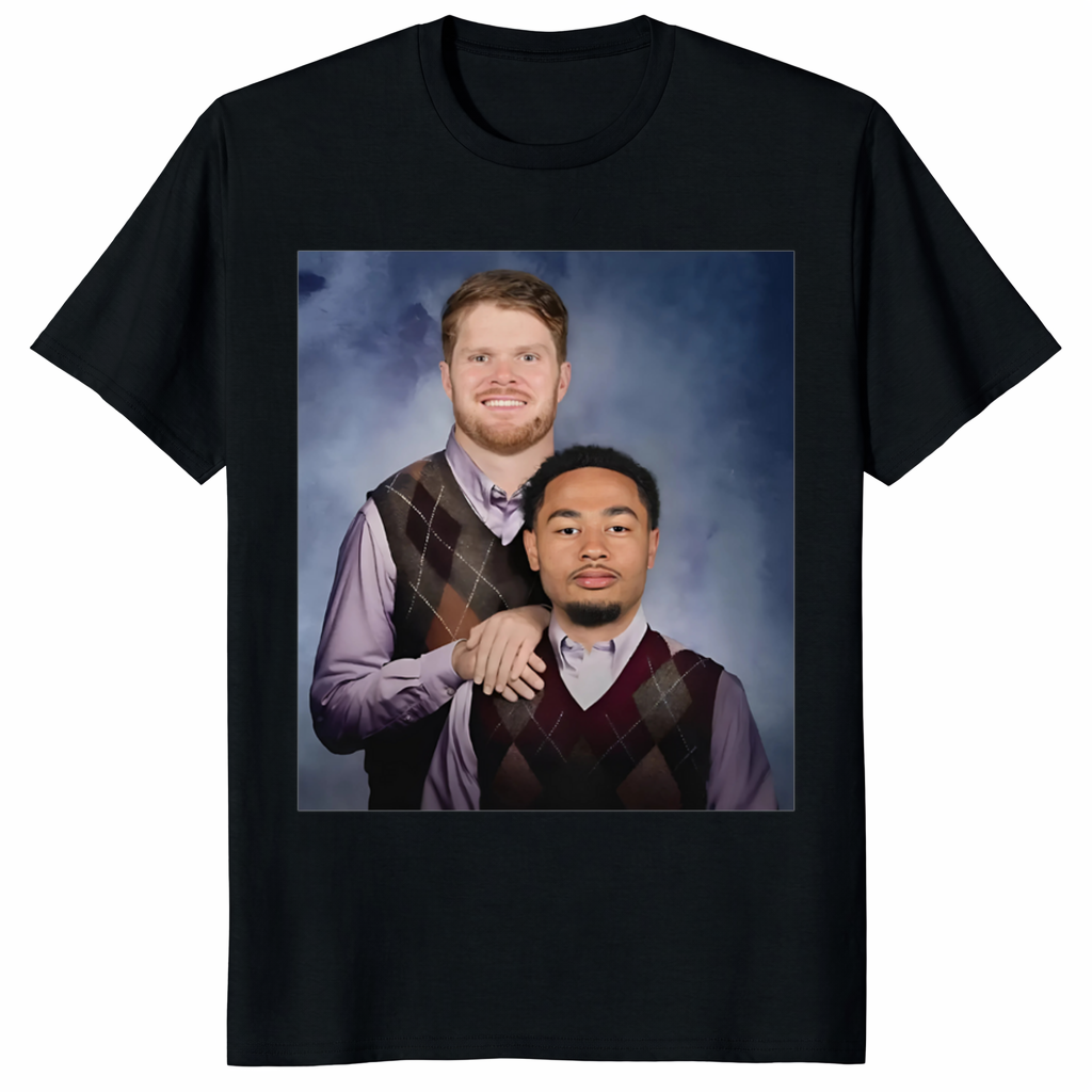 The Sam Darnold & Smith-Njigba Seattle Step Bros Football Tee takes inspiration from pop-culture parody and modern football meme culture. The “Step Bros” concept taps into the kind of humor fans instantly recognize — exaggerated chemistry, unexpected pairings, and jokes that land especially well on game day.