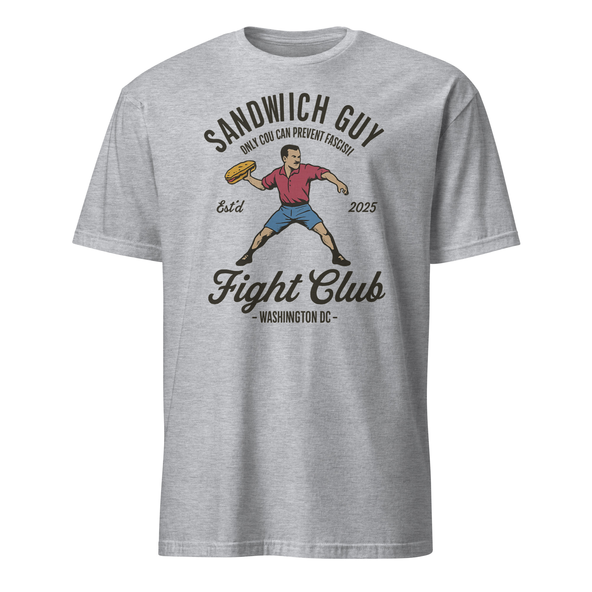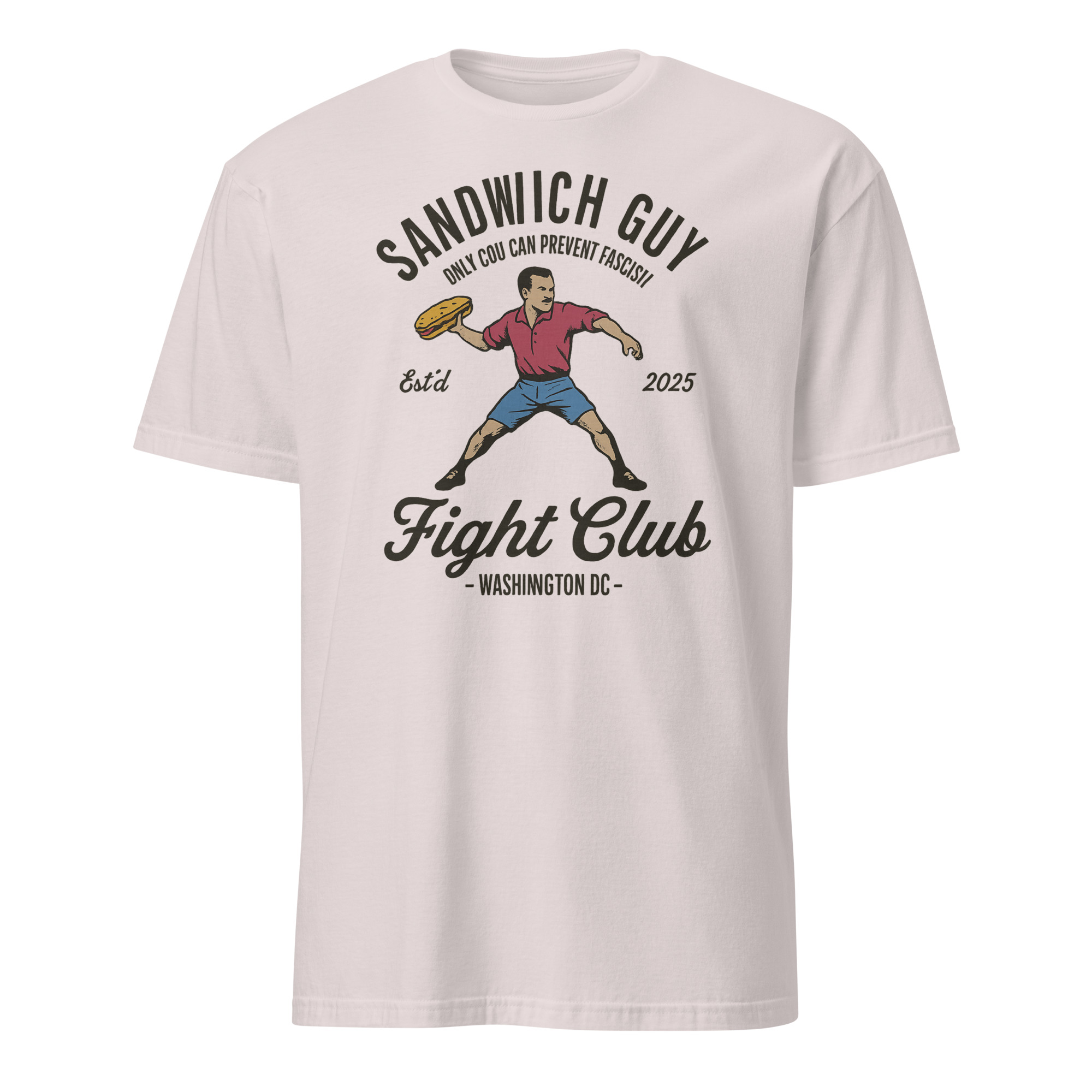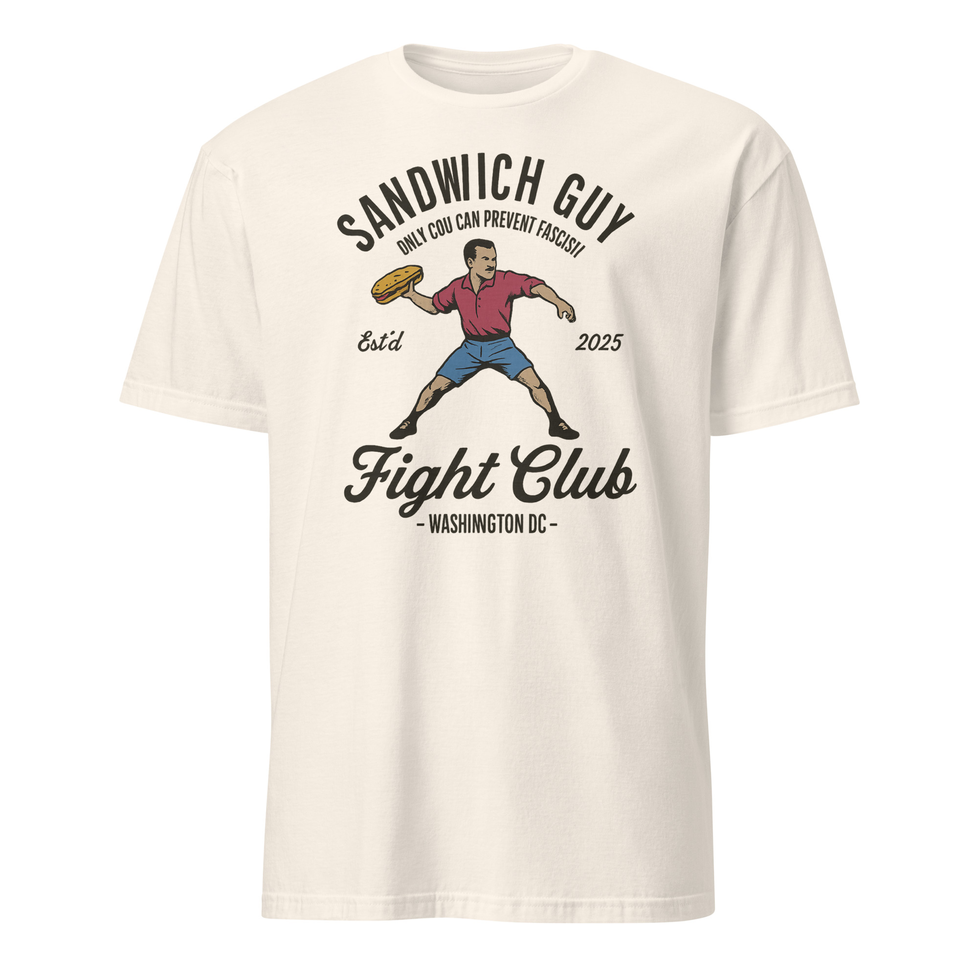 Bring bold satire and protest energy into your wardrobe with the Sandwich Guy Fight Club Shirt by Cuccico. Inspired by the viral D.C. moment, this tee fuses meme culture with activism. Featuring the iconic slogan “Only You Can Prevent Fascism”, it blends humor, politics, and style seamlessly.